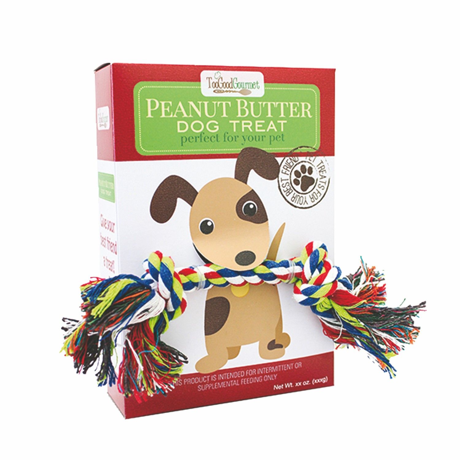 Treat your pup with an outstanding multi-purpose product with this peanut butter dog treat and rope toy box. 4 Oz. This dual-function giveaway comes with a box of dog treats and a bonus rope toy, ideal for playtime. What a great handout for pet stores, shelters, vets, and more! Available in assorted colors and can be customized with an imprint of your company logo and message for maximum brand exposure.  5.5" W x 8" H x 1.875" Diameter